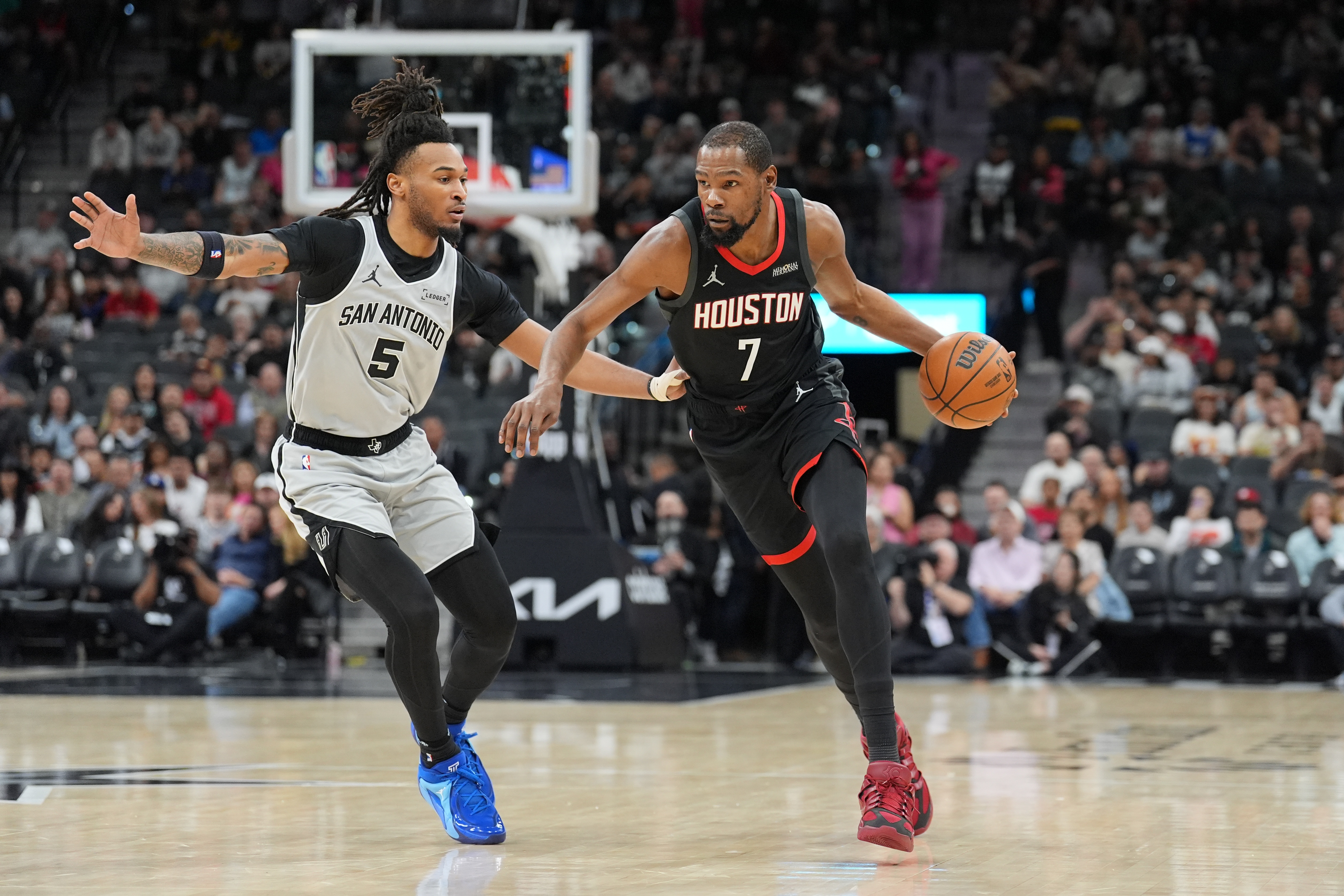 马刺是文班带4射手体系,火箭由于申京+阿门两个点没稳定三分能力甚至被完全放空还不敢投,阵容特点决定了双方首发的场上空间差距。